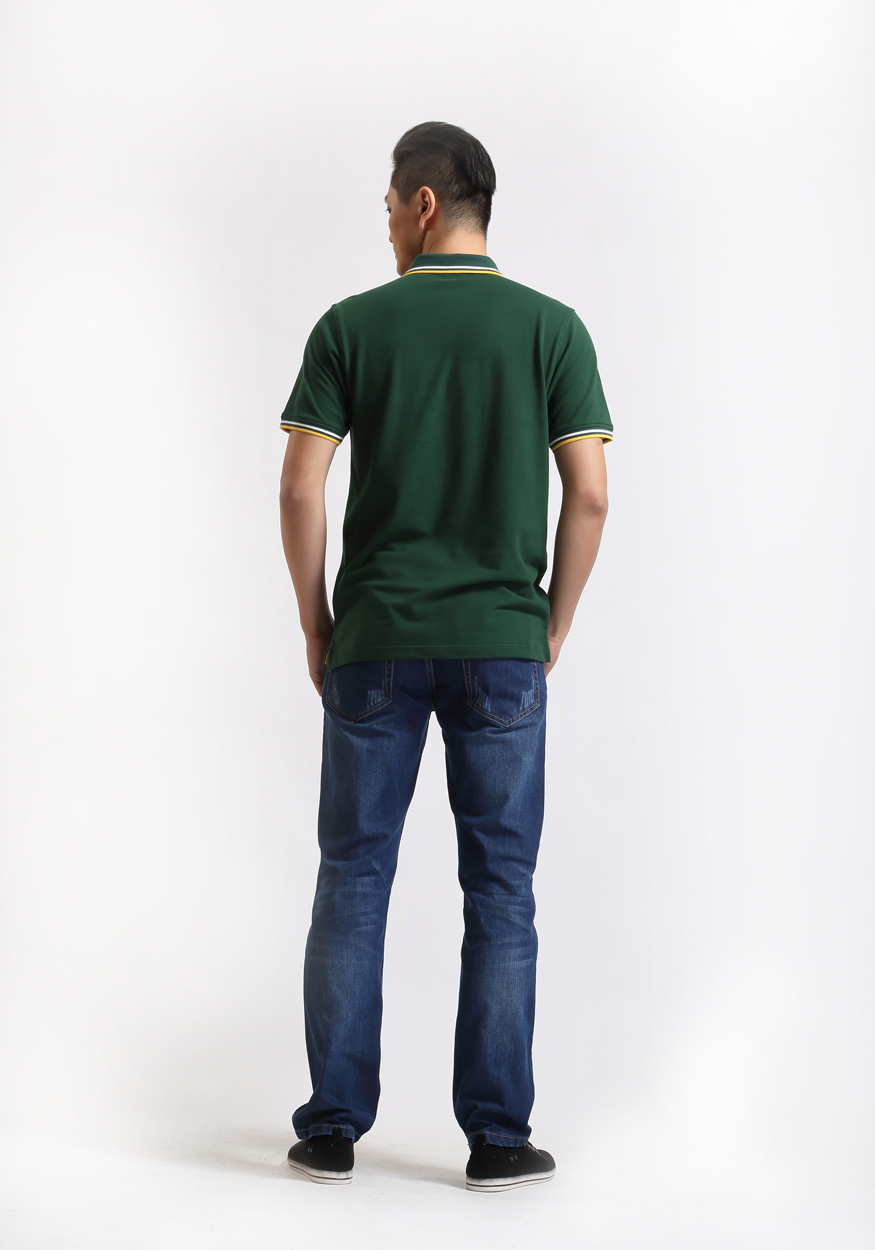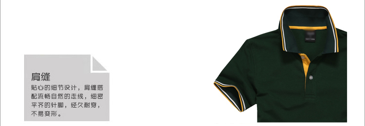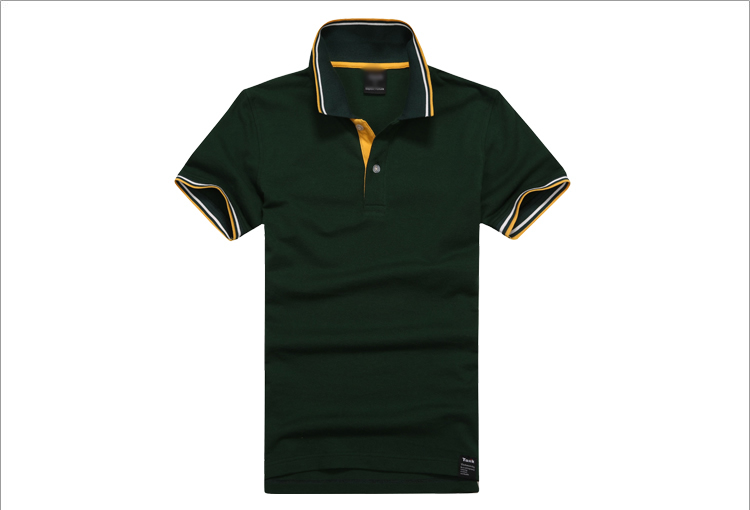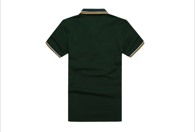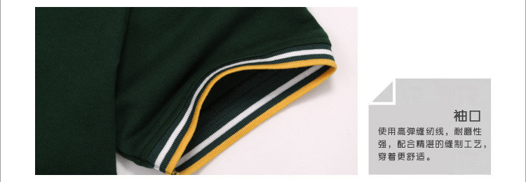 > 墨綠色珠地棉POLO衫款式,領(lǐng)袖間條撞色,男女時(shí)尚款定制