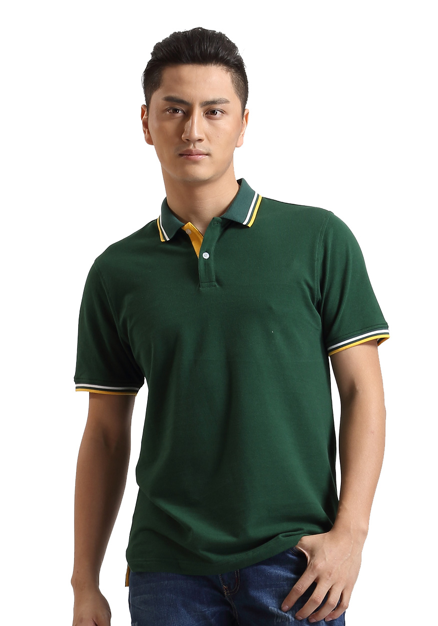 墨綠色珠地棉POLO衫款式,領(lǐng)袖間條撞色,男女時(shí)尚款定制