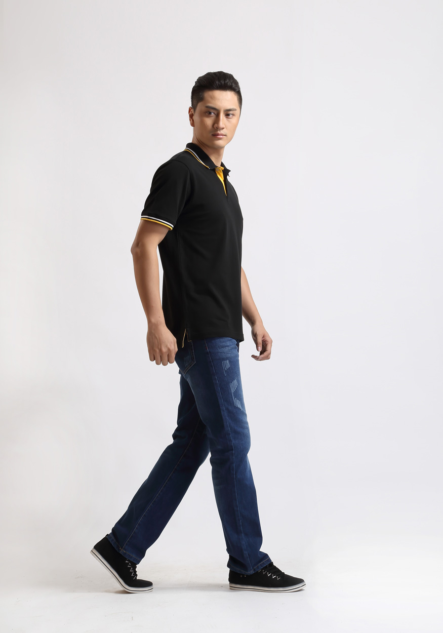 黑色珠地純棉t恤衫,領(lǐng)袖間條撞色,門襟撞色款式制作