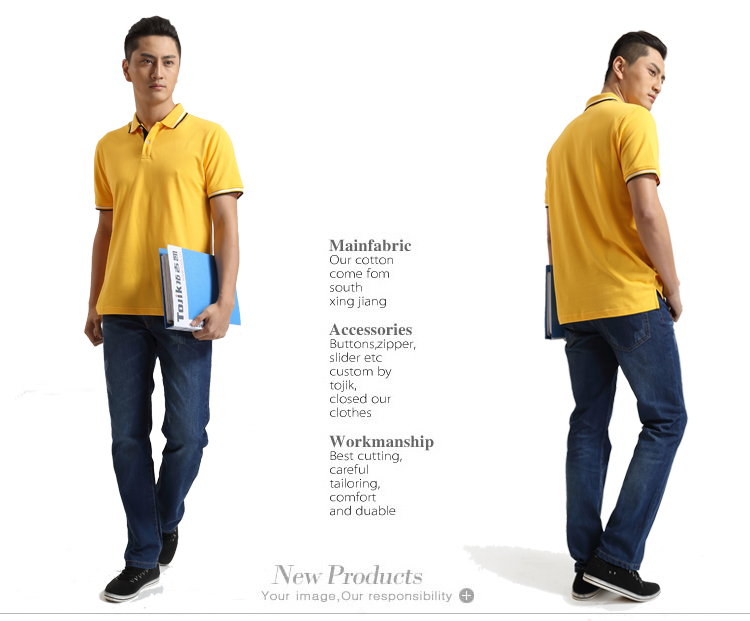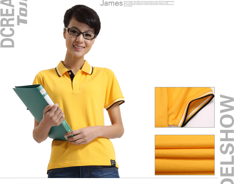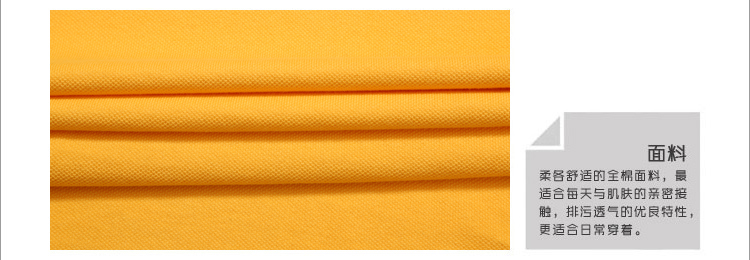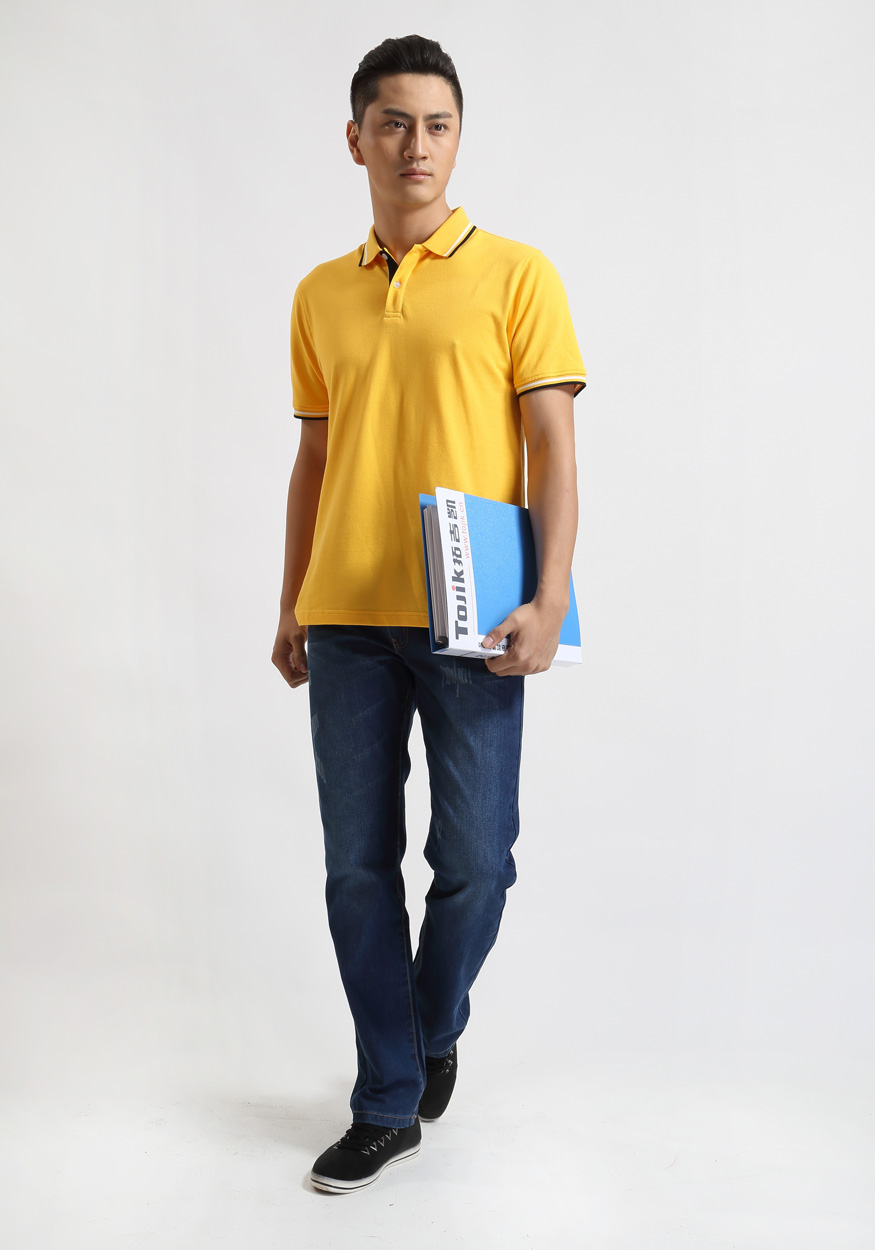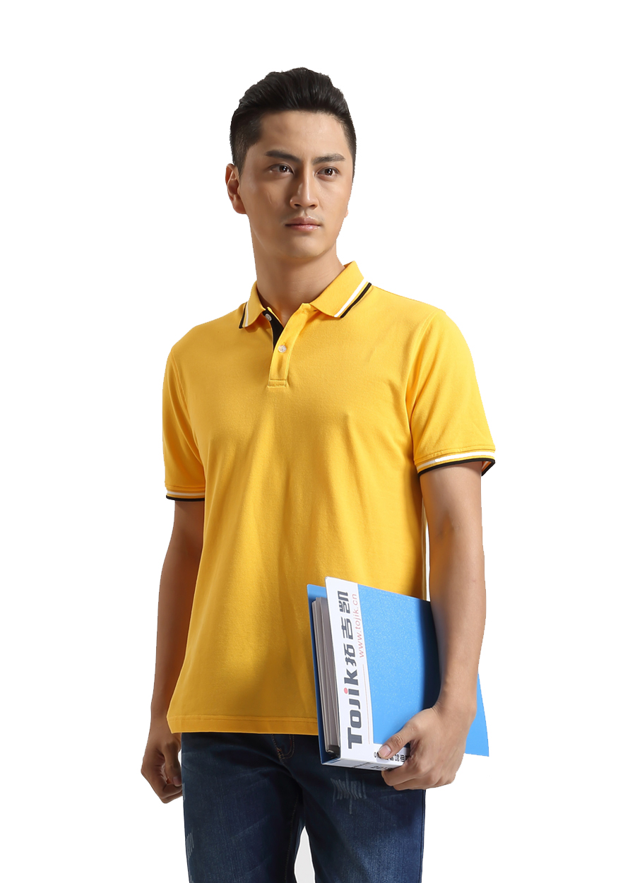 > 嫩黃色珠地純棉POLO衫,領(lǐng)袖間條撞色,男女時(shí)尚t恤衫制作